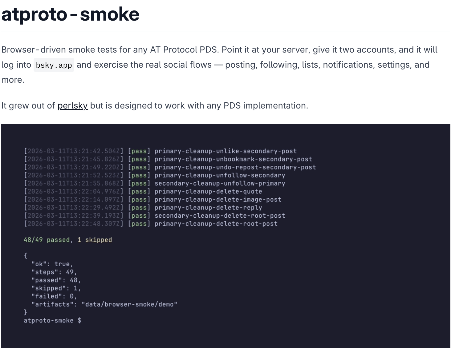 From there it was a matter of two more days of hard prompting to get it to release, adding what's missing, and developing atproto-smoke through this process which can now be used against any PDS by writing a small adapter and a config file.